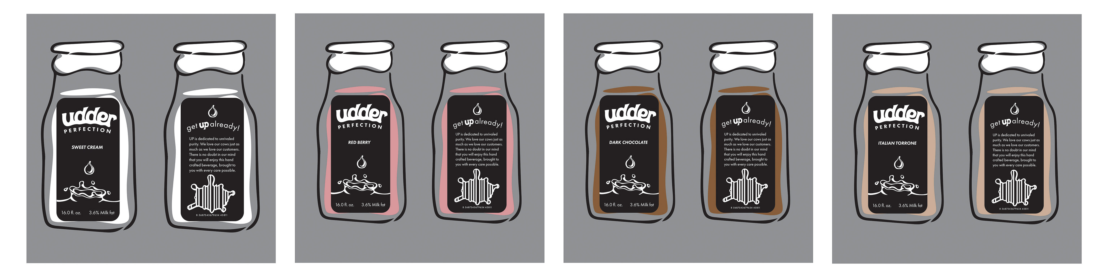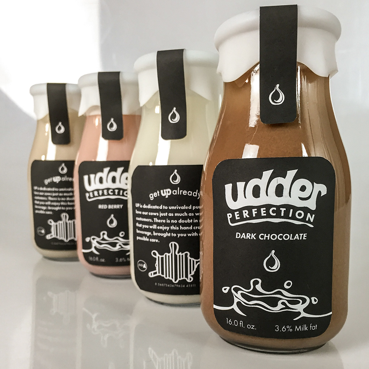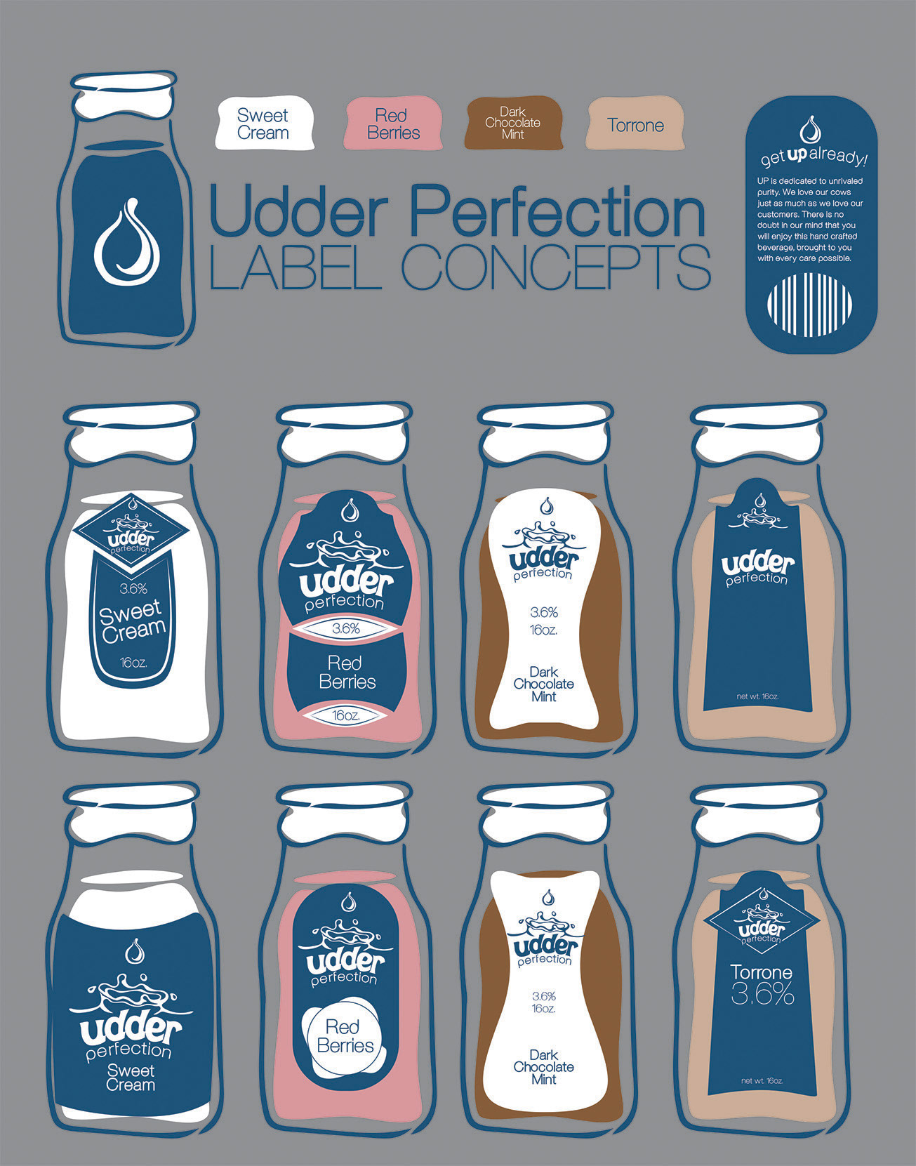 Udder Perfection is a fresh and unique approach to boutique dairy products. UP is bold yet unobtrusive; strong without being loud. UP attracts a market of healthy, active adults looking for satisfying "splurge" snacks.